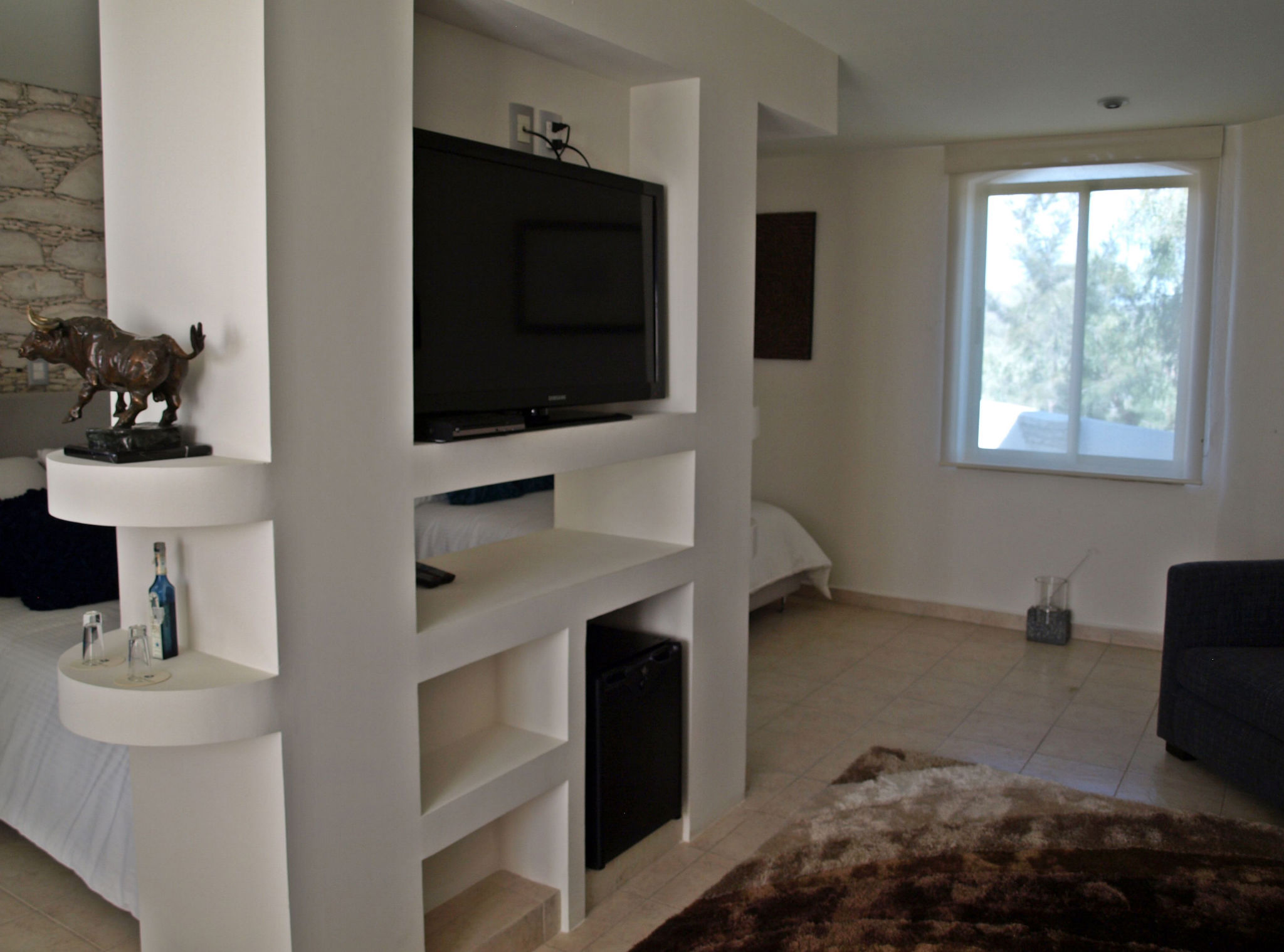 Ubicada en el primer piso, esta habitación aporta una vista de nuestras instalaciones, permitiendo que nuestros huéspedes aprecien la alberca climatizada, las mesas al aire libre, el jardín, la cancha de volley ball y de fondo, la majestuosidad de la Sierra Gorda de Guanajuato.